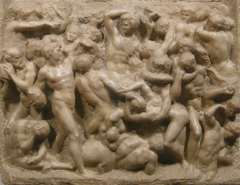 Lorenzo, always on the lookout for talented artists, had Michelangelo move into his household, and he was set to work under the tutelage of Lorenzo’s sculptor Bertoldo di Giovanni. His earliest surviving work in marble was created around this time, the Madonna of the Stairs, a bas-relief depiction of a hulking great Madonna (the first of many of Michelangelo’s muscular women) holding the Christ child at the foot of some steps. Already we can see motifs that would reappear in Michelangelo’s later work: an emphasis on the human figure, a limited background stripped to the bare essentials, and twisted bodily forms. It is, in essence, a Christian theme in a classical style, which he would again fuse when working on his Pietà. Michelangelo followed this up with the Battle of the Centaurs, a magnificent, more ambitious relief of writhing bodies in an energetic, cramped landscape.
