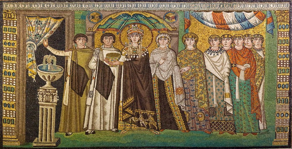 The fate of Theodoric’s depiction in mosaic at Sant’Apollinare in the city is a wonderful example of the great waves of continuity and change that engulfed Ravenna. After Theodoric’s death, and his entombment in the domed tower that still stands, the Eastern Emperor Justinian ordered the general Belisarius in 533 to bring the Ostrogoths to heel. After Belisarius took Ravenna in 540, the incredible mosaic portraits of Theodoric that lined the walls of Sant’Apollinare were altered to remove the figures of Theodoric and his court. In their place, a gold wall of mosaic brick or curtains were inserted in an attempt to erase the memory of the Ostrogothic – and non-Catholic – ruler. This was just one part of the whitewash; more explicitly, under the aegis of the new rulers from Constantinople, San Vitale was erected, with mosaics in the presbytery depicting Justinian and the Empress Theodora. Neither ever visited the city, but their stern countenances and commanding presence so close to the altar of the new church left no room for doubt as to the ultimate authority in Ravenna.
