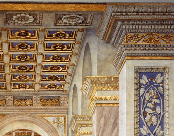 Sixtus’ obsessions – humanism, a desire to embellish Rome and the promotion of his family – are all embodied in Melozzo’s fresco. The setting is an imaginary classical arcade, lined with marble pillars, arches, a gilded coffer ceiling and a half-hidden single Corinthian column in the background. The architectural details are superbly executed, adding to the illusion of looking in on a real place as well as neatly framing the scene. A key passage in Leon Battista Alberti’s De Pictura, written in 1435, is Alberti’s description of composing a painting by imagining an ‘open window’ through which you look upon a scene, a message clearly absorbed by Melozzo. On top of this function, Melozzo’s architectural details, including his careful rendering of the intricate features of the cornice and the exuberant ceiling, reinforces the wealth, power and luxury of the della Rovere. The floral panels, decorated in della Rovere oak, are a gilded aperçu of this message placed in the fresco’s foreground.