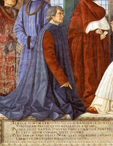 Giving the Romans these antiquities was a political move, a lavish dispense reminding the city authorties on the Capitoline who was in charge. But it was also a means of positioning the people of Rome and the city in relation to their classical antecedents, giving the Romans a visual aide–mémoire stressing their link to their illustrious ancestors and drawing a line from the Caesars to the popes. It was a move wholly within the spirit of the age, which was as much preoccupied with looking back as it was exploring the future. Sixtus’ donation of these works to the city was thus directly in step with his humanist, classical interests. Melozzo’s fresco, with its classical pillars, arches and architectural details, as well as its topic, is a mirror of Sixtus’ (and Platina’s) intellectual proclivities. With these developments as a background, we can understand the fresco as Sixtus’ desire to have his intellectual interests recognised and recorded.