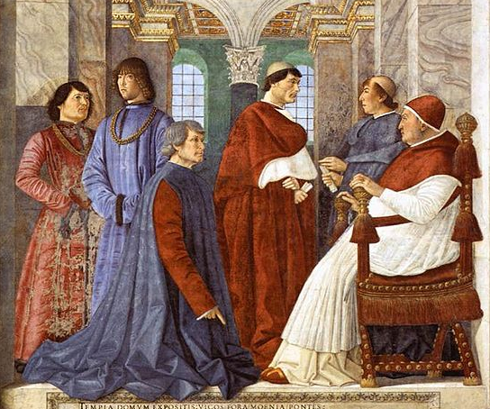 Finally, standing directly next to Sixtus is Pietro Riario (though some claim it is Raffaele Riario depicted), who had died three years before Melozzo set to work. Pietro was the son of Sixtus’ youngest sister Bianca. He was made a cardinal at 26 and given the church of San Sisto, an ancient church named after a previous Sixtus pope. In total, two sets of brothers, two cardinals, one Prefect and one Lord – all within a few short years of Sixtus’ pontificate. Tensions inevitably existed between these men, especially Giuliano and Girolamo, the two central figures, Giuliano allied to the French and the Roman Colonna family, Girolamo with the Spanish and Orisini clan. Their rivalry endured the length of Sixtus’ reign, and, despite not being his uncle’s favourite, Giuliano would emerge victorious, assuming the throne of St. Peter in 1503. Yet it would be a mistake to assume that Sixtus’ dynastic dreams were satisfied with the nephews in Melozzo’s fresco. At then end of 1477, three more Sixtus relations were promoted to the cardinalate. This unblushing nepotism and egregious flouting of papal convention mean that for all of Sixtus’ architectural adornments to Rome, his reputation remains tarnished.