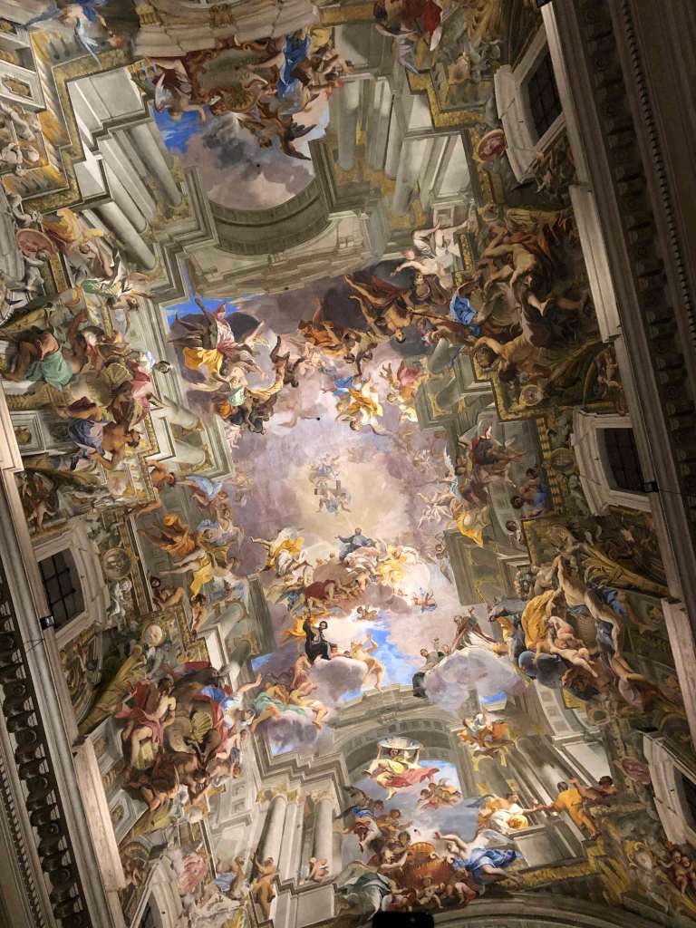 Sant’Ignazio is Ignatius of Loyola, founder of the Society of Jesus, renowned for their counter-reformation zealotry. Being English, and therefore considering suspect anything that smacks of ostentation, it took a while to adjust to the church’s extraordinary decorative schema. The interior is vast, like the hull of a great ship; massive pillars divide the nave from the yawning aisles and elaborately decorated chapels, each strewn with relics, portrait busts, canvases, effigies, crucifixes, columns, altars and gilded statuary combined in a bric-a-brac of Baroque energy. The trompe l’oeil ceiling fresco by Andrea Pozzo exacerbates the sensation of having entered an exalted sphere, an unworldy abode. Magnificent as the church was, walking among the effigies had a depressing effect, and it was a relief to return to the hustle of life outdoors.