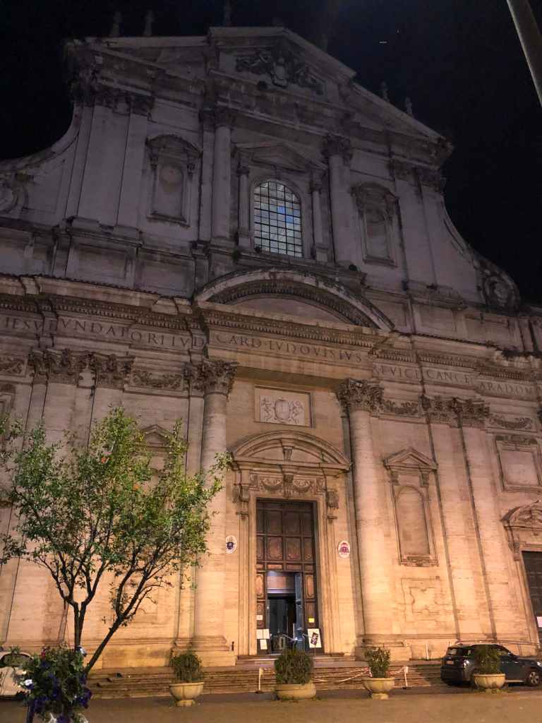 Florence, Ken Clark wrote in Civilisation, is a city of ‘hard heads, sharp wits, light feet, graceful movement’. Rome, meanwhile, is ‘a city of weight, a city that is like a huge compost-heap of human hopes and ambitions, despoiled of its ornament, almost indecipherable, a wilderness of imperial splendour’. To move from the former to the latter is to abandon the place of ‘free and active men’ and arrive in ‘a world of giants and heroes’. In antiquity, these giants and heroes were Apollo, Minerva, Jupiter and Venus. From the end of antiquity until the twentieth century, these luminaries were supplanted by martyrs and saints, with homes in the forms of basilicas erected in their name. One honorific church, Sant’Ignazio, is one of those enormous baroque churches in which Rome specialises, its façade larger than the piazza over which it towers. At midnight on our final night before we ventured south, we found the doors open and, in that tentative, self-conscious air that one always adopts in a church, wandered in.