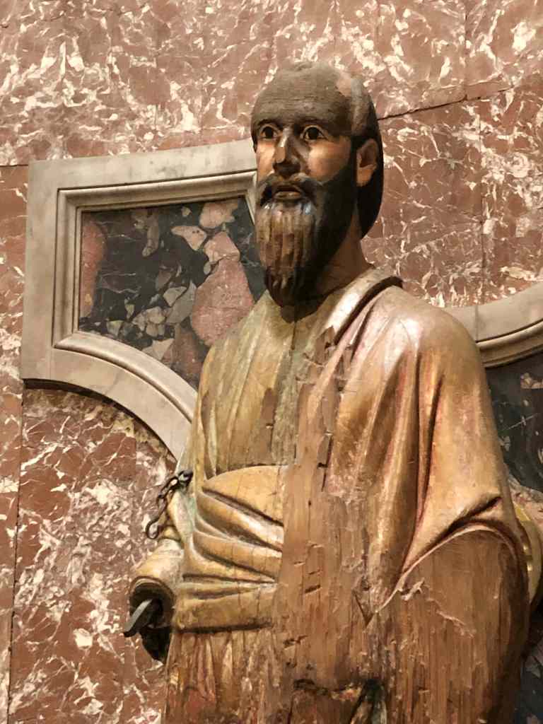 And there certainly were positives to going unnoticed. On one ferociously hot Saturday morning, I awoke around ten with a hangover that could floor a uni rugby team. I must have finished that bottle of Chianti. Rousing myself, I discovered that I had overnight lay on and crushed my new glasses. When I held them up they looked like they had been violently twisted in a fit of pique, like some tortured spider’s legs. Determined not to waste the day and feeling very sorry for myself, I felt my way gingerly to the metro and took a long journey to San Paolo Fuori la Mura, by legend built on the site of Paul’s tomb. The church was reached by a long walk on foot from the station. I was almost weeping with relief when I crawled into the shade of its portico. Inside, in a chapel by the altar, was the most lifelike statue I had ever seen, a wooden carving of Paul. I couldn’t take my eyes of it. Now I knew why Protestants had done all that icon smashing; it really did in some way seem to be alive. I sat patiently and waited for it to blink, before deciding that it was probably time to go and have a long lie down.