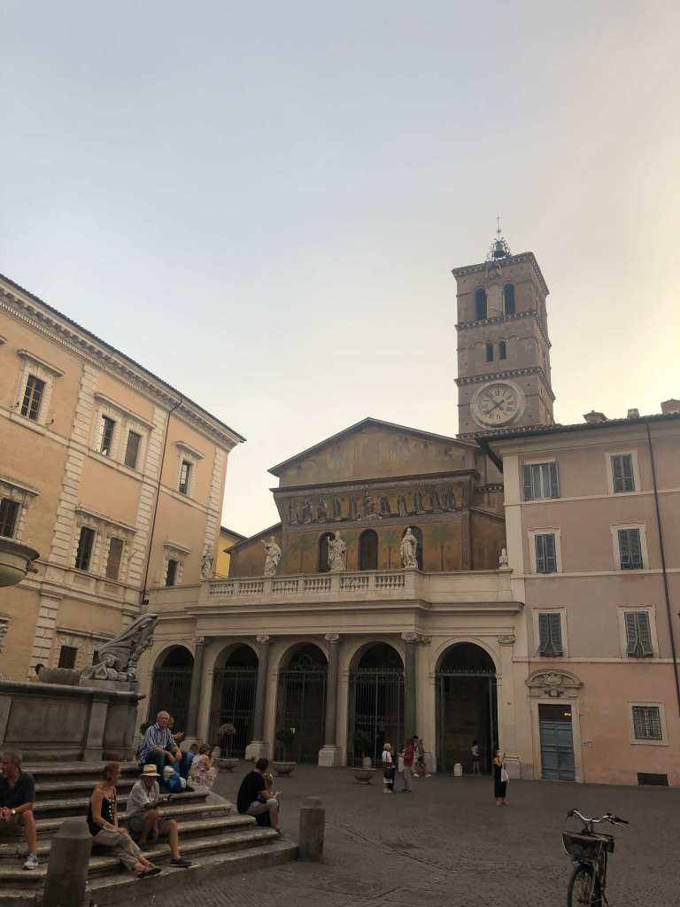 I took a particular delight in their variety – the spherical Santa Costanza, in which Constantine’s daughter was entombed, decorated with ancient mosaic on its barrel vault; San Benedetto in Piscinula, a tiny, fragile construction, like a tottering old ship, with its cracked Cosmati pavement; Santa Maria in Ara Coeli, haughty and indomitable atop the Capitoline; San Giorgio in Velabro, stripped of its baroque flummeries in an austere, almost Protestant fashion; and Santa Maria in Trastevere, its façade a combination of different styles, host to all the modifications and embellishments of the centuries (home, also, to a stunning mosaic cycle by Pietro Cavallini).