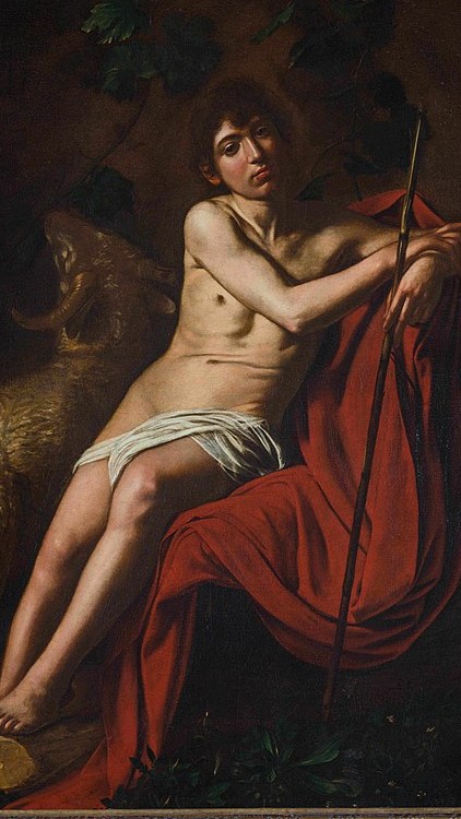 “I am the voice of one crying in the wilderness” – John the Baptist, forerunner of Christ who, fulfilling Old Testament prophesies, prepares the path for the Son of God. Artists’ portrayal of John took as their guide the Gospels’ account of his life and appearance. In the Book of Mark, John is described as baptising in the wilderness, “clothed with camel’s hair, and with a girdle of a skin about his loins.” In the Borghese St John Caravaggio forgoes the camel pelt, but includes other signifiers of the Baptist: the staff, the loincloth, the blood-red drapery, and the lamb of God – here, as in the Capitoline John (above) rendered as a ram, probably a translation of the Biblical Greek arnion which serves for both lamb and ram.