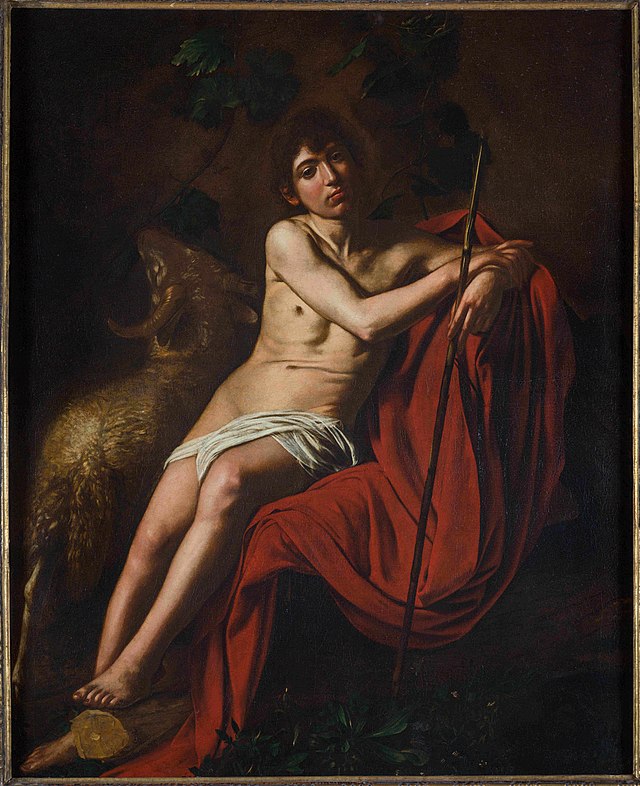 The rather louche John depicted here is dripping in sensuality, and indeed it was not uncommon for artists to imbue St John the Baptist with sexual overtones. Already we have the Capitoline St John of Caravaggio’s, the playful prepubescent nude with a cheeky smile. Leonardo’s St John (1513/16) also has the eponymous figure fix the viewer with a suggestive stare and a beguiling curl of the lips. Caravaggio’s homoerotic Borghese John should therefore be considered part of a tradition of depicting John the Baptist as an alluring, attractive young man.